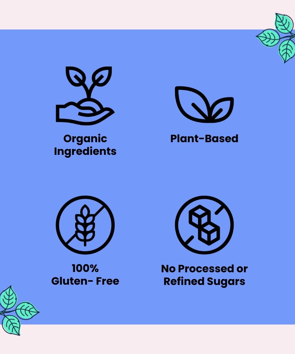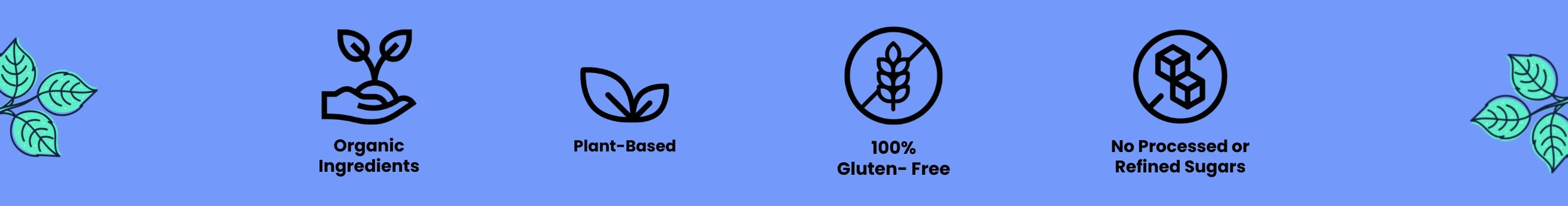 All our ingredients are Plant-Based, Organic & 100% free from Gluten/Dairy/Eggs/Soy.